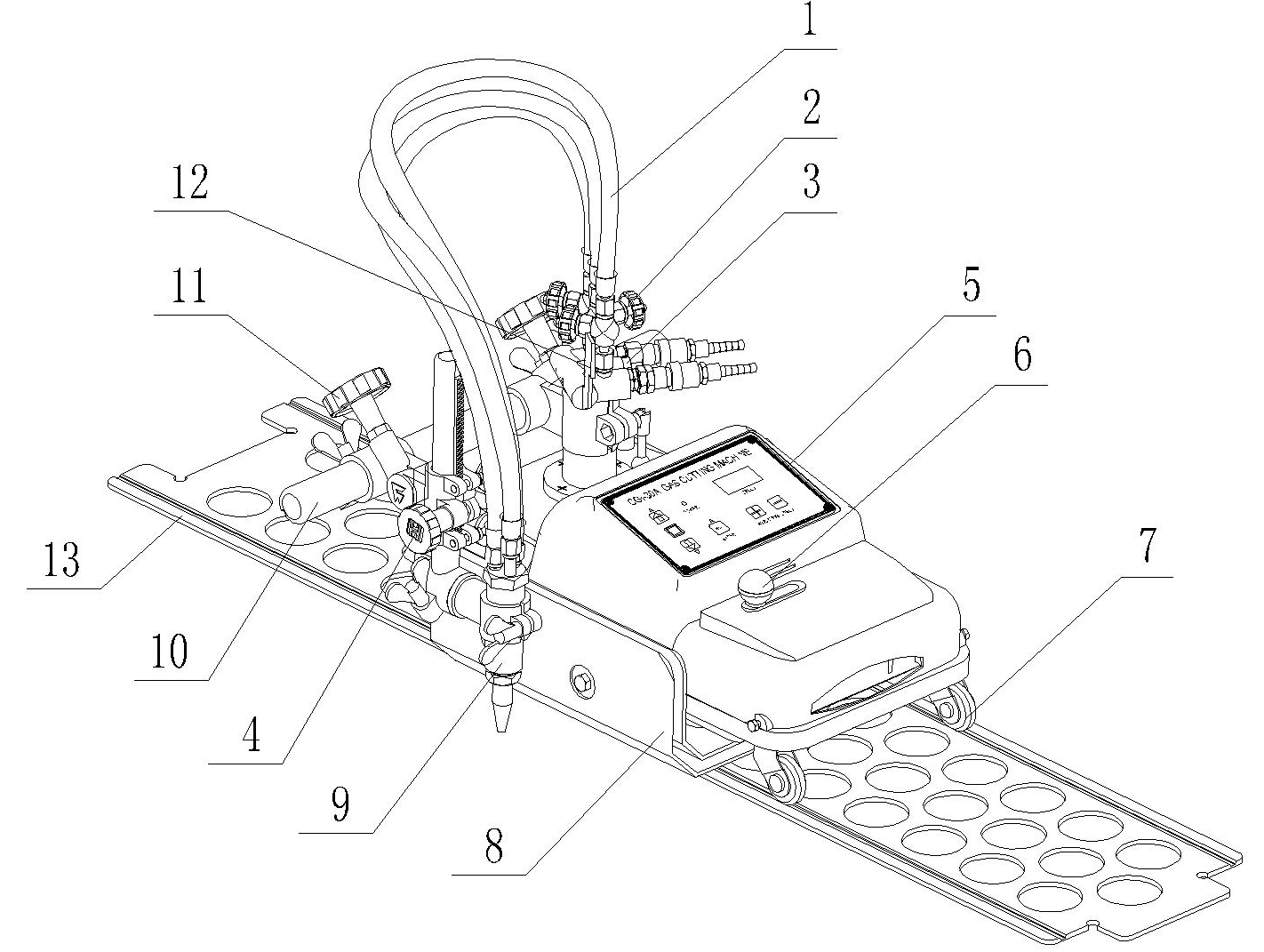 3. 氣體分配器: 11.橫移手輪:通過調(diào)節(jié)該手論,調(diào)節(jié)割炬